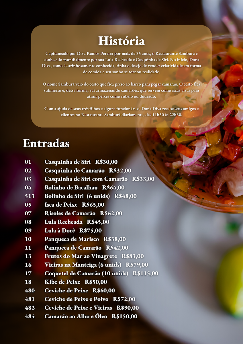 Welcome to Restaurante Samburá, a hidden gem located in the heart of Angra dos Reis, Brazil. This casual yet vibrant eatery shines with its dedication to fresh, locally-sourced ingredients and an authentic Brazilian menu. The star of the show is undoubtedly the Moqueca, a rich fish and shrimp stew that has garnered rave reviews from diners. Many note its generous portion sizes, often enough to satisfy more than two people.